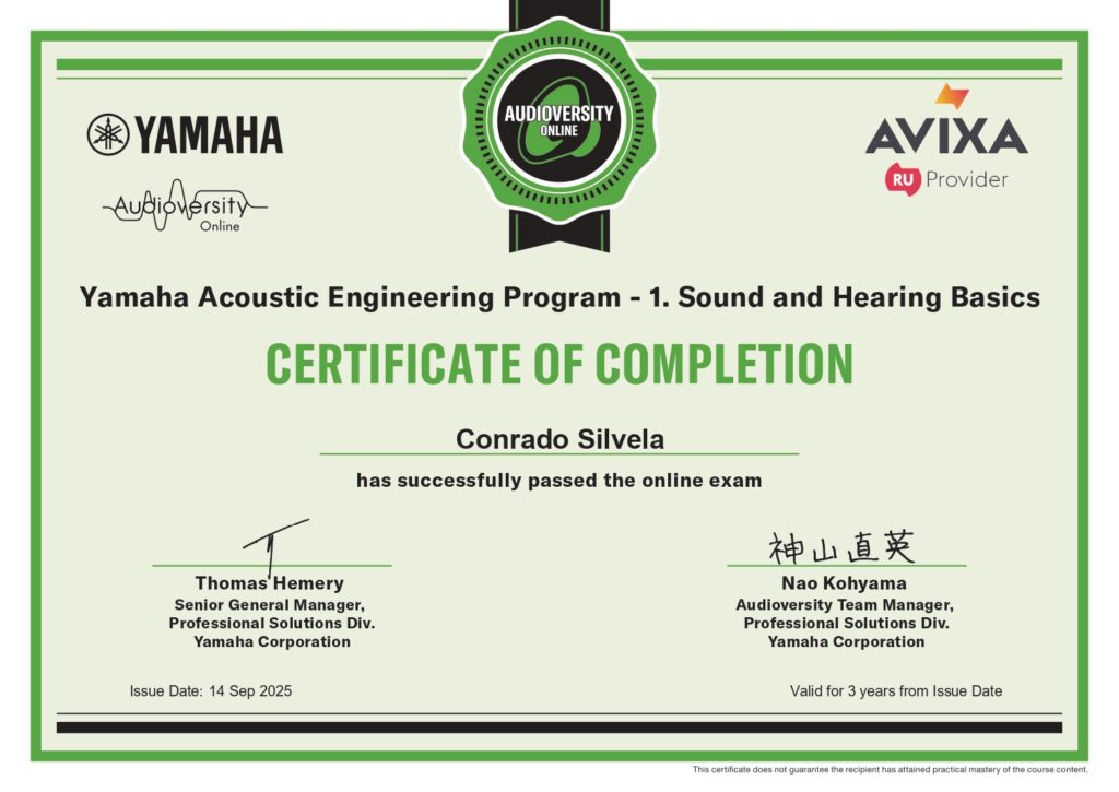 Curso Yamaha Acoustic Engineering Program – 1. Sound and Hearing Basics cursado en Septiembre 2025.